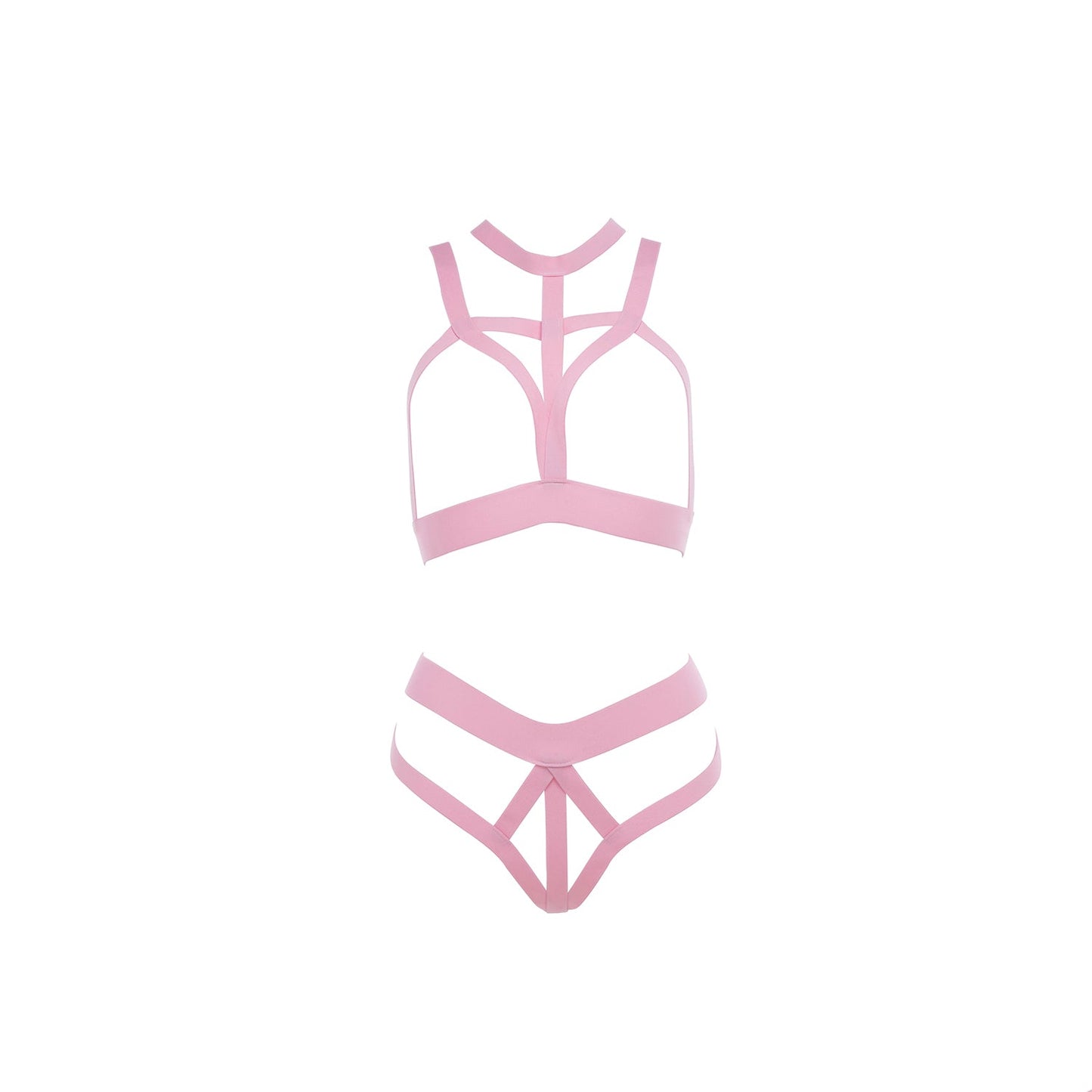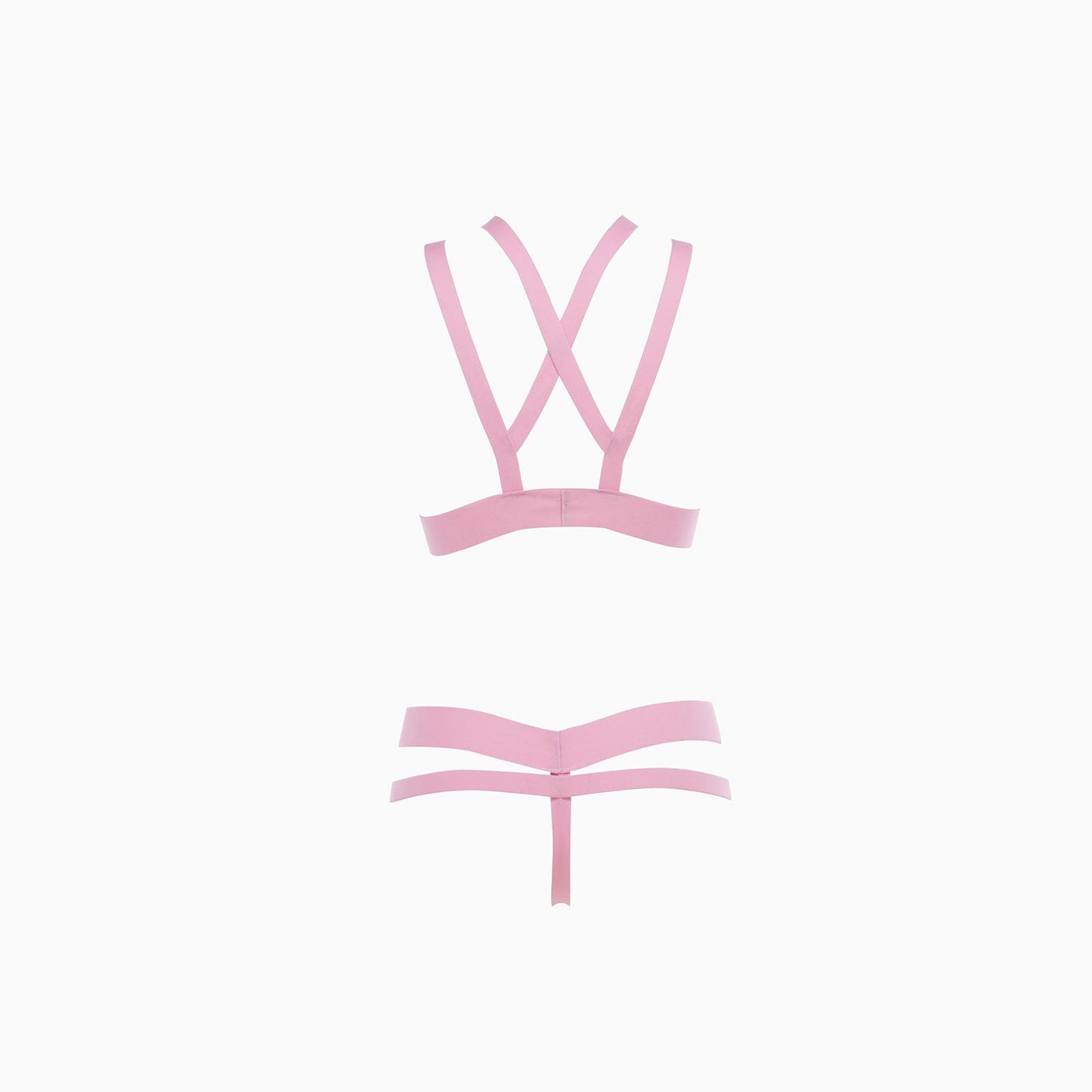 The electric sweet spot between love & lust... For your fantasizing pleasure, elastic straps that hug, sculpt and showcase all of you. Ultra-strappy bra & thong set.
