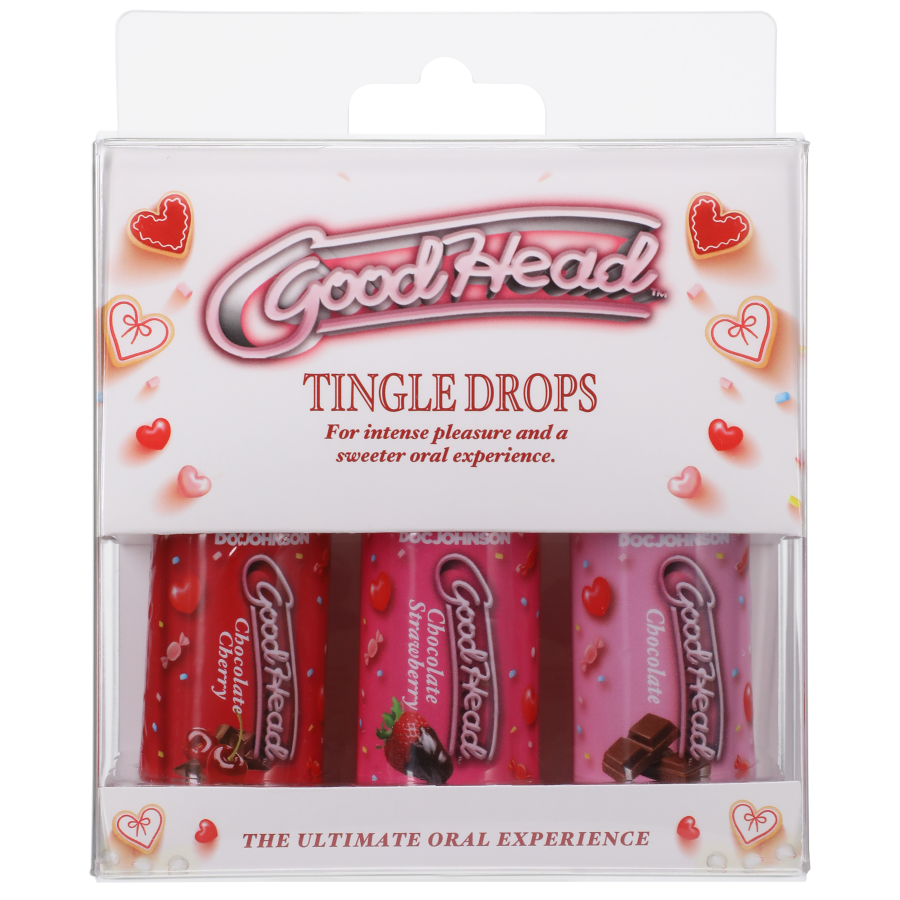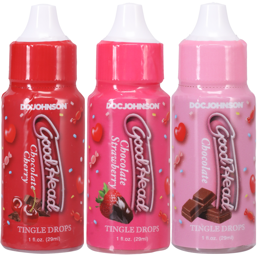 Tingling, tantalizing sensations and three delicious flavors enhance your oral play in this three-piece set of GoodHead Tingle Drops. The pack includes three 1 fl. oz (29 ml) dropper bottles of each Chocolate, Chocolate Cherry, and Chocolate Strawberry oral sex enhancers formulated to create a cool tingling sensation on contact.